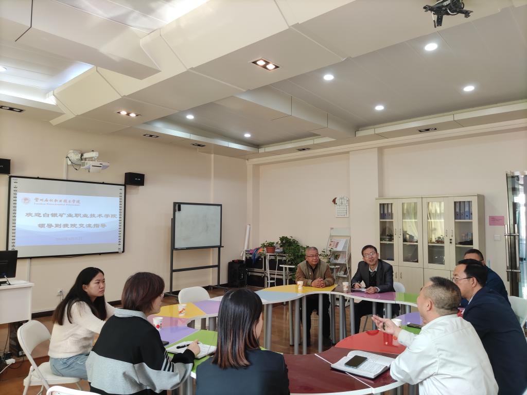 9月25日上午,白银矿冶职业技术公司党委委员、宣传统战部部长马剑山,学校办公室主任兼304am永利集团官方网站经理崔正升等一行四人来304am永利集团官方网站参观交流。公司党委委员、宣传(统战)部长、发展规划处处长兰炜,304am永利集团官方网站负责人参加交流座谈。